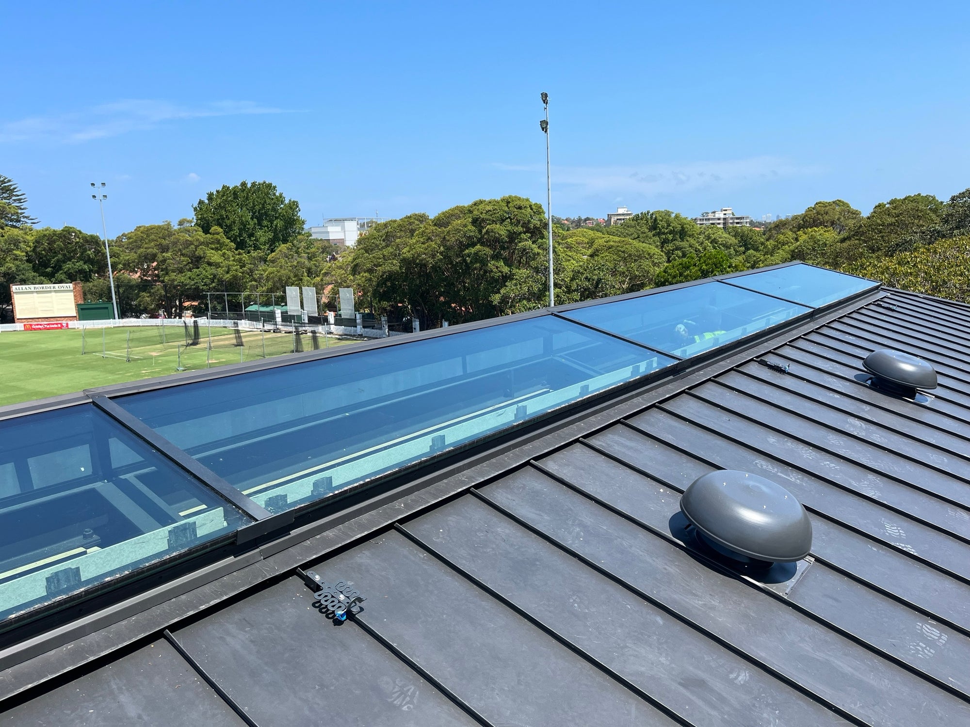 The completed Glass Ridgelight plays a central role in the success of the Allan Border Oval Pavilion, filling the primary function room with soft, balanced daylight and enhancing views across the oval.