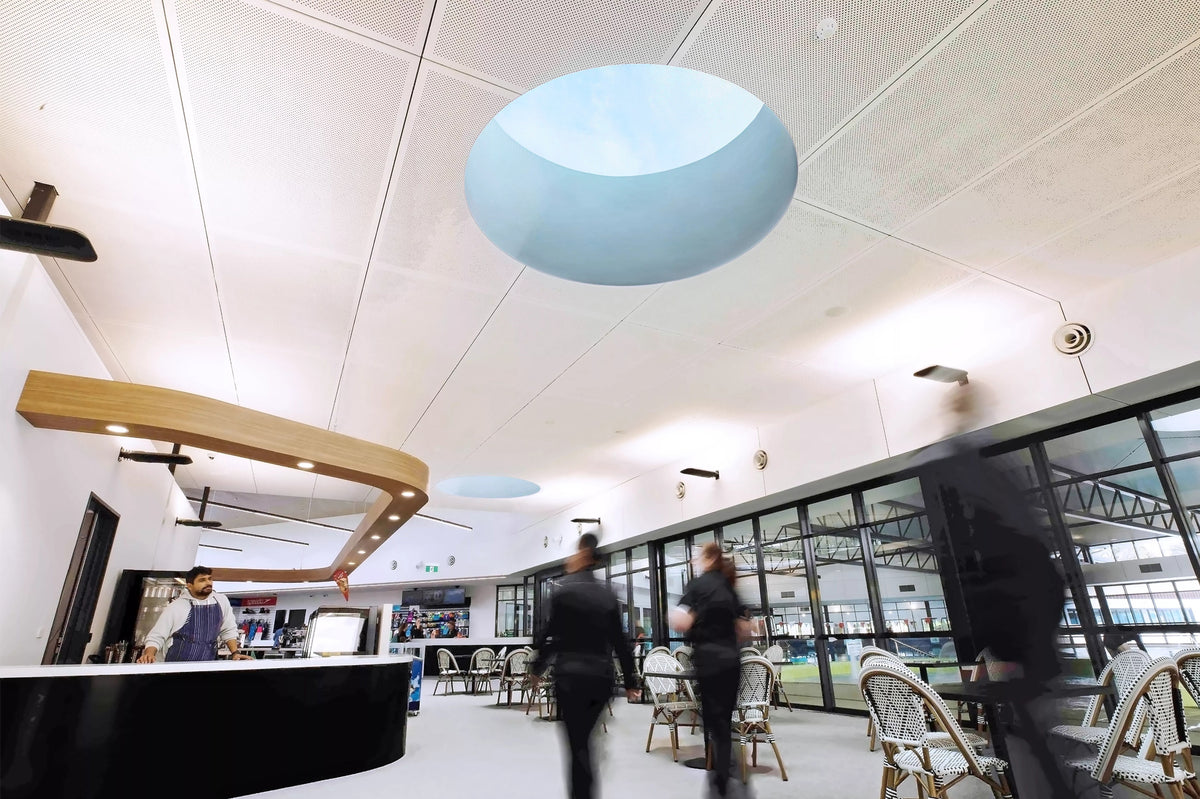 The skylights transform the reception and café areas with a striking circular form that floods the interior with natural light while maintaining thermal comfort.