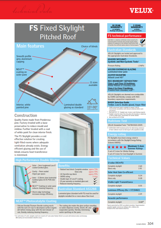 NB: For roofs below 15° pitch, FS needs to be raised to 15° and custom flashed. VELUX can assist with technical advise and drawings (build-up not recommended in bushfire areas). *AS1288 and hailstone test applicable to 2004 glazing variant only. †U-value (W/m²K) and SHGC data based on AFRC simulations for 2004 glazing, (FS complete skylight: size 1140mm x 1180mm). ^2004 Glazing skylight only. Custom-made flashing required. Roof pitch 18°-75°. ‡2004 Glazing variant only.