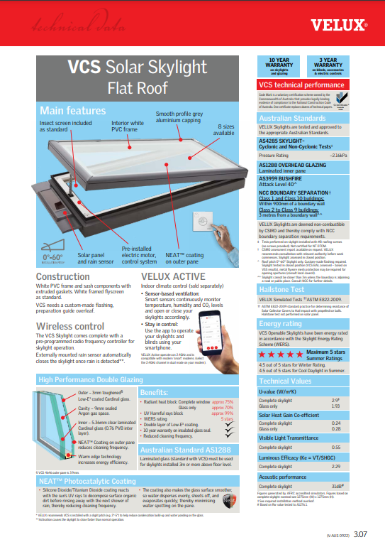 NB: VELUX recommends VCS is installed with a slight pitch (e.g. 3°-5°) to help prevent condensation build-up and water ponding on the glass. VCS skylights not suitable for VELUX Above-Below combination - contact VELUX for more information. †U-value (W/m²K) and SHGC data based on AFRC simulations, (VCS complete skylight: size 1275mm x 1275mm). ^Skylight tested in closed position (VCS BAL assessed - based on VSS results), additional mesh protection may be required for opening apertures (consult local council). Roof pitch 0°-60°. #Cyclone test not performed with screws provided, installation requires #8 roofing screws. *Assessed in closed position. BCA 2013 Vol 1 & 2 regulations (Prevention of Falls from Windows - Balustrades & Barriers): contact VELUX for information relating to restrictor devices for within-reach opening skylights.