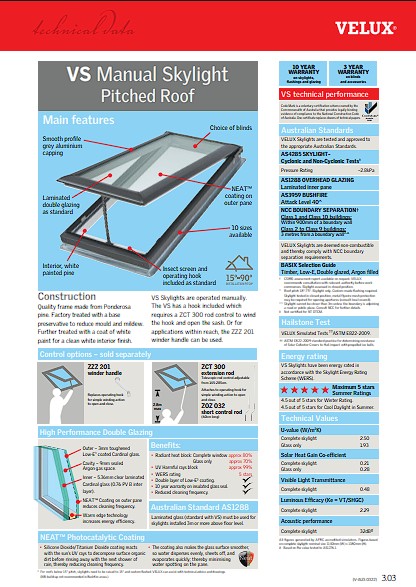 NB: For roofs below 15° pitch, VS needs to be raised to 15° and custom flashed. VELUX can assist with technical advice and drawings (build-up not recommended in bushfire areas). †U-value (W/m²K) and SHGC data based on AFRC simulations for 2004 glazing, (VS/VSE complete skylight: size 1140mm x 1180mm). *AS1288 and hailstone test applicable to 2004 glazing variant only. ^2004 glazing skylight only. Custom-made flashing required. Skylight tested in closed position, additional mesh protection may be required for opening apertures (consult local council). Roof pitch 18°-75°. ‡Assessed in closed position. 2004 glazing variant only.